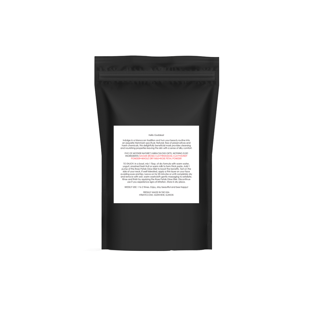 TO ENJOY: In a bowl, mix 1 Tbsp. of dry formula with warm water, yogurt, smashed fresh fruit or warm milk to form a thick paste. Add 1 pump of the Rose Petals Glow Elixir to boost the benefits. Test on the side of your neck. If well tolerated, apply a thin layer on your face avoiding eyes and lips. Leave on for 20 minutes or until completely dry and remove with wet, warm washcloth gently massaging to exfoliate. Rinse and finish by applying the Rose Petals Glow Elixir. Discontinue use if you experience signs of irritation. Store in a dry place.